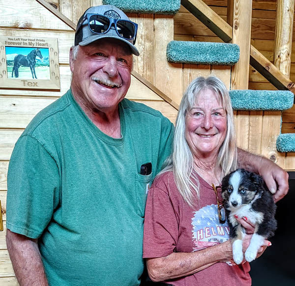 This gorgeous blue merle male's dedicated new owner flew all the way from western New York to Montana for this sassy little fella. He flew home on his new mom's lap and was the envy of everyone they met in the airports.